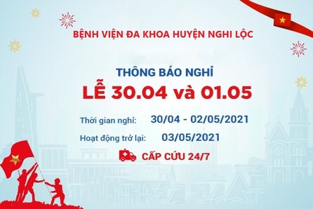 Bệnh viện đa khoa huyện Nghi Lộc xin trân trọng thông báo lịch nghỉ lễ chào mừng 46 năm ngày Giải phóng miền Nam, thống nhất đất nước và 135 ngày Quốc tế lao động (30/4-1/5/2021)